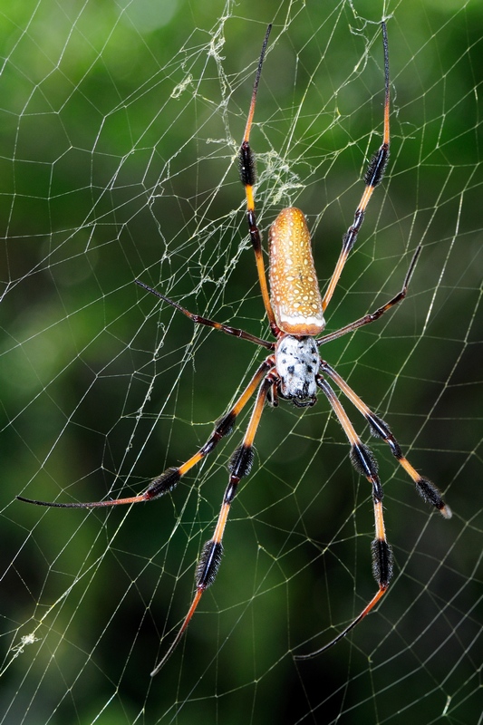 It is a Golden Silk Orbweaver (Nephila clavipes) and a beautiful representative of it’s species. The openness of the web made it possible to get both top and bottom from the same spider.