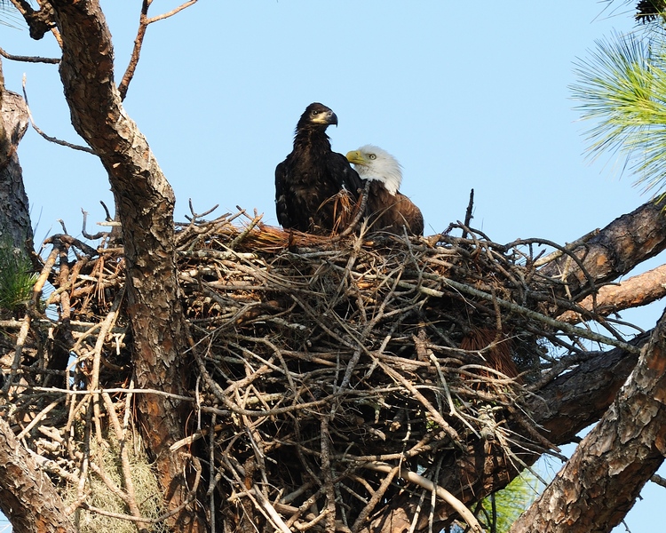 In 08/09 they mated and produced two eggs. Unfortunately, the tree which held the nest was damaged in a windstorm. As you can see in the two pictures above, the nest was basically in a fork with some slight extra support at the bottom. Eagles continually add to their nests and as a result the smaller support collapsed under load. the The nest fell and the eggs were broken. When that occured, they moved to their current location next to the Punta Gorda History Park and built a new nest. No young were produced at the new location. The new nest seems a lot more secure than the first so we hope to see them for many more years.