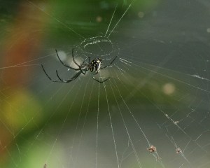 Then, as I was leaving, I noticed something in the bushes on the side of the path. It was a Venusta Orchard Spider repairing it’s web. I took one shot with available backlighting to capture the web and discovered that it was a rainbow of color with the spider looking like a jewel in the center. The slight breeze and rapid movements of the spider as it repaired it’s nest didn’t make for a great picture of a spider but, it showed a real natural beauty. The first picture is the Rainbow Weaver and the second a more mundane shot of a similar spider.