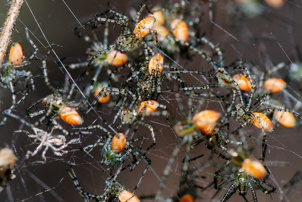 We did find one really fun thing. One of my friends asked me how I found the tiny spiders I sometimes showed the club. I told him that tiny spiders spun tiny webs and all you needed to do was find them. The saltbush seeds were flying everywhere so, it was easy to see where they were sticking in the fine webs. We found one and were then surprised to see that it was literally filled with a new hatch of tiny spiders no more than 1 to 2 millimeters in size including the legs. They were so clustered in the web that we found it difficult to isolate one for a picture.We took quite a few shots of them and then turned the target over to others as we walked around. Later, we came by the same path and I decided to see if they had dispersed to make the shooting easier. WOW, they were even tighter together than the first time. It appears that a fly had stumbled into the web and it was party time. The left shot here was the first sighting of the web and the right was taken on the re-visit.