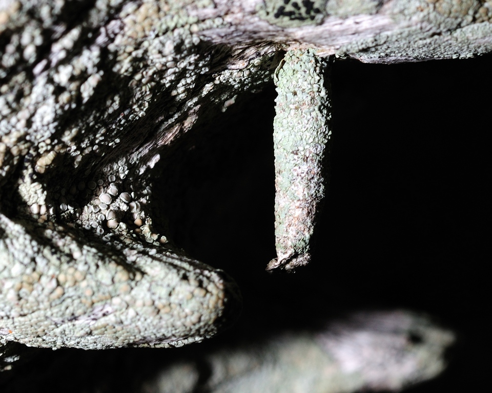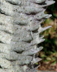 I am often surprised when I look closely at things and discover something that is not readily apparent. For example, this morning I went out to take a look at some of the garden plants to see what needed pruning. I was looking at one of the pineapple palms and thought I saw an odd spot on the bark. Although the bark is rough, the protrusions are relatively regular. This was outside of the pattern. Look at the picture on the left and see if you notice it.