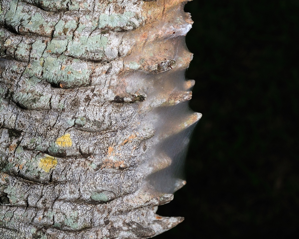 The picture on the right shows the oddity in closeup.  Now, I see these from time to time on my palms.  They are really easy to find on the smooth trunk palms but, more difficult on the rough.  What this is is the larvae of a type of bagworm moth.  The eggs hatch in a web that looks like a translucent bag on the side of the tree.   The left photo here shows a hatching bag and the right another view of the larvae.  The larvae eat Lichens from the trunk leaving the black spots you can see above it but, at the same time, they cover their bodies with the lichens to blend in to the bark.  Nearly perfect protective coloration and much like a snipers ghillie suit in concept.