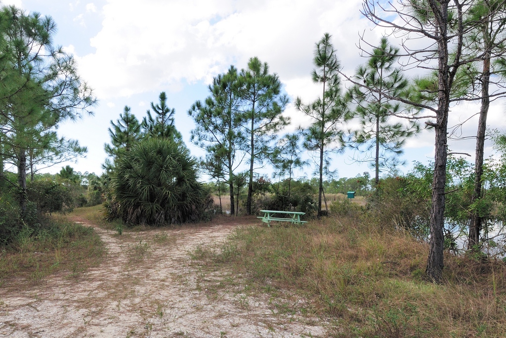 The path to the right from the picnic area runs below the bank surrounding the marsh. You will be surrounded by trees. On the first leg, you will hear and see traffic on US-41 through the trees. Although still close to the marsh, this part of the primary trail is pine flatwood. A few yards away is a rougher trail which follows the border of the marsh.