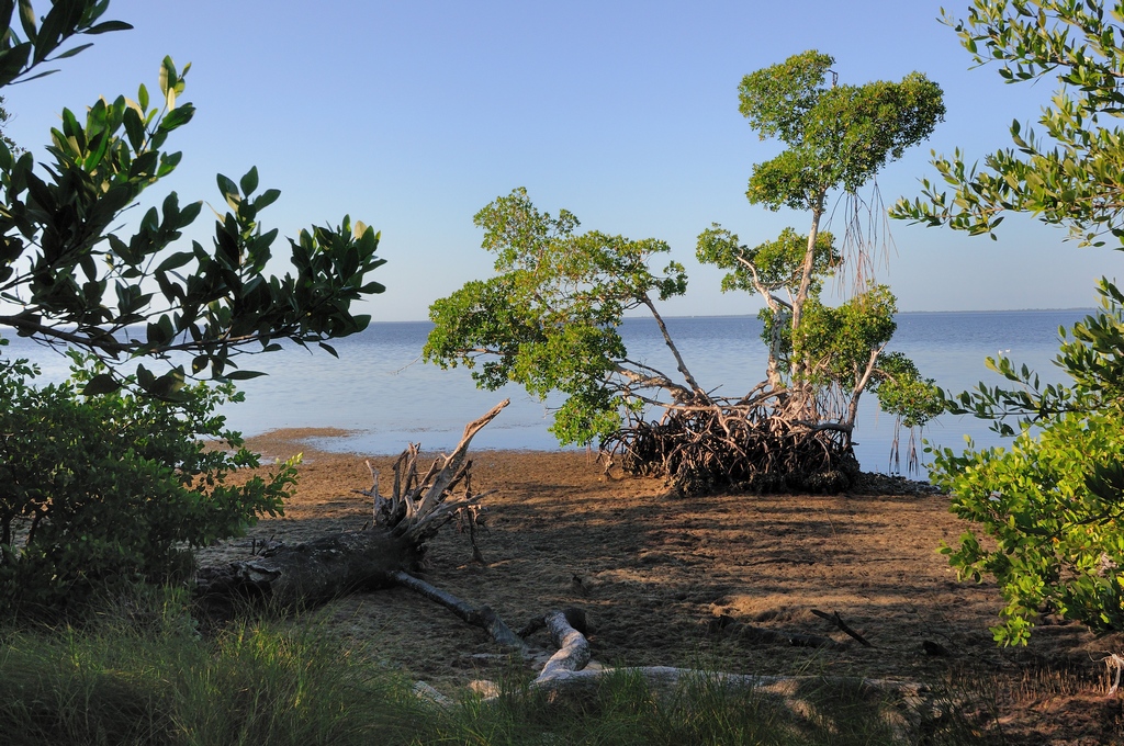 This was taken today with a very low water level due to the strong north winds. Normally, you can only walk on the white sand at the right side of the picture but, today, you could see the gentle slope of the shore. Wearing shoes you don’t mind getting wet greatly expands your opportunities. The Charlotte Harbor Environmental Center often runs wading exploration trips here. The path enters the mangroves at the end of the white sand and meanders through them with little sidepaths from time to time. The total length of the path is less than half a mile. It is not wheelchair accessible.