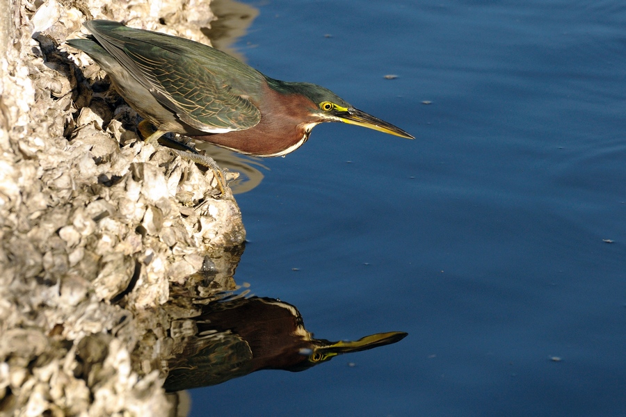 This is a fairly typical pose (which I titled ‘Standing on the seawall watching all the gulls go by’. This one that shows why people sometimes think the Green Heron is a short necked bird. It’s not though, it’s fairly long neck feathers overlap each other and make the neck appear short. Once it starts hunting though it’s true extent appears.