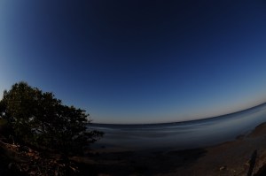 This was taken with the lens tilted downward. As a result, the horizon has become an arcing curve at the top of the picture. The two little grey triangles in the bottom corners are actually a straight seawall that I am standing on. Composition takes some care, the shadow on the right is me.