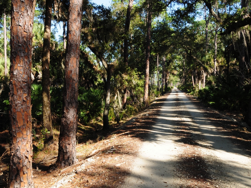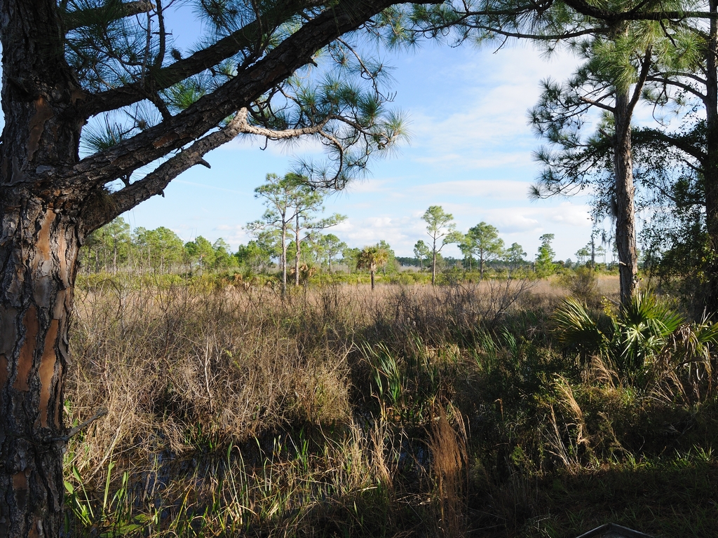 This view continues for several miles broken by the occasional pond. Just beyond the trees there is normally an open flatwood environment. You will see that some of the trees are marked as Red Cockaded Woodpecker nesting spots.