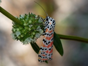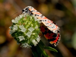 In spite of their bright colors, these fold their wings tightly and aren’t easily noticed when on more colorful flowers. In flight, you will see them as a flash of pink in the undergrowth.
