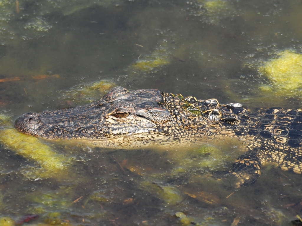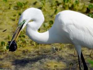 Whenever I’m at the rookery, I take the time to have a look to see what is happening on the other side of the road. Since the Brazilian Pepper has been removed, there seems to be more feeding activity on that side. Today I found a Great Egret who had managed to get hold of a small Florida Softshell Turtle and a small Alligator.