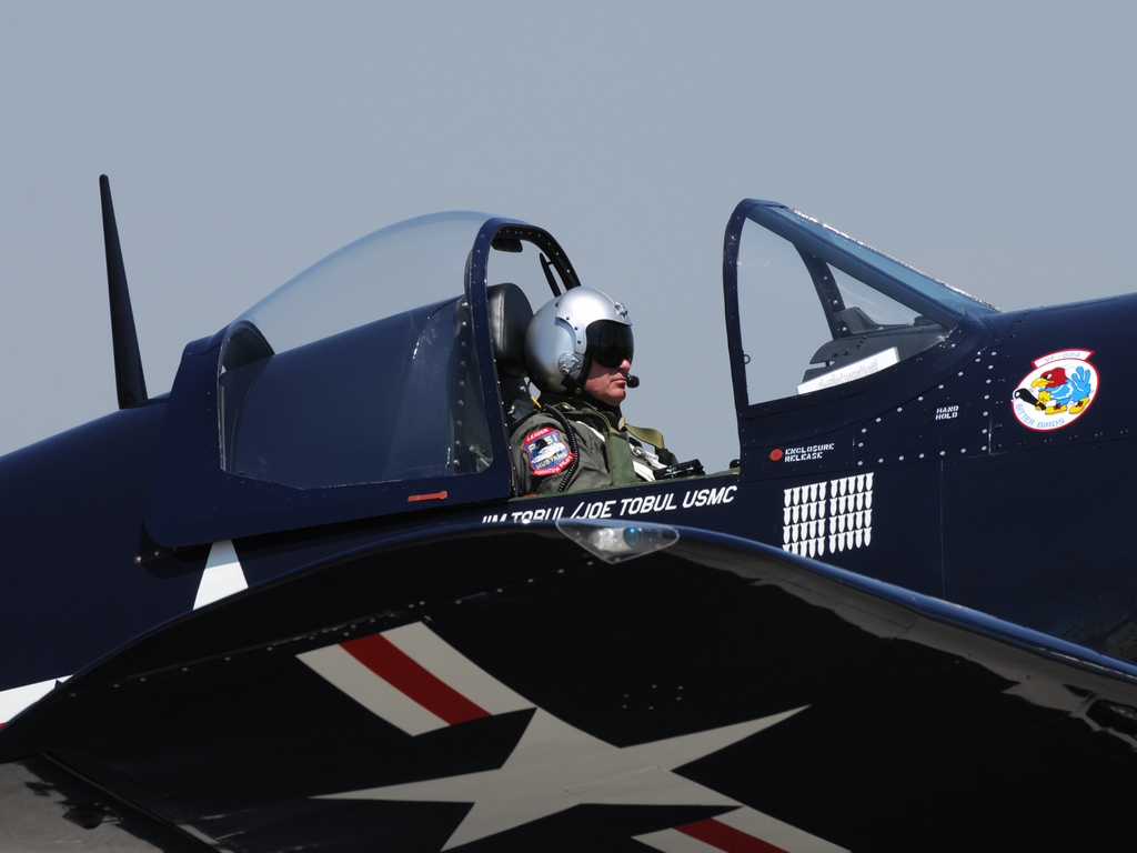 The shooting was tough since the wind meant using a slightly different angle of approach than other years and that affected the sun angle on passing shots. Here are a couple more of the F4U. The first shows the distinctive wing shape of the Corsair and the other the pilot before take off. Just click for a larger view.