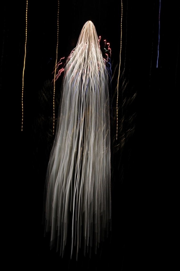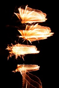 Obviously, you can’t predict the height, elevation or color of a particular launch so, you are going to get a lot of unpredictable results. That’s just a starting point though, I like unpredictable results so, after getting a few reasonable blossom shots, I start panning up and down to see what I find in the final image. Here are a couple of those.