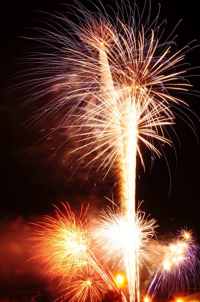 You can see that the actual trails of the fireworks are rather short. You might want to get more of the ‘blossom’ . Fireworks are self illuminating and what you see as a blossoming picture is actually a lot of individual burning pieces which your eye remembers as the trail. So, we need to expose our digital sensor or film remember over a longer period of time to see the trail. To start with, I use a shutter speed of 2 seconds at f8.0 unless I have some other reason like the foreground above. Obviously, with that sort of shutter speed, you are going to need a good support, so, be sure to use a tripod.