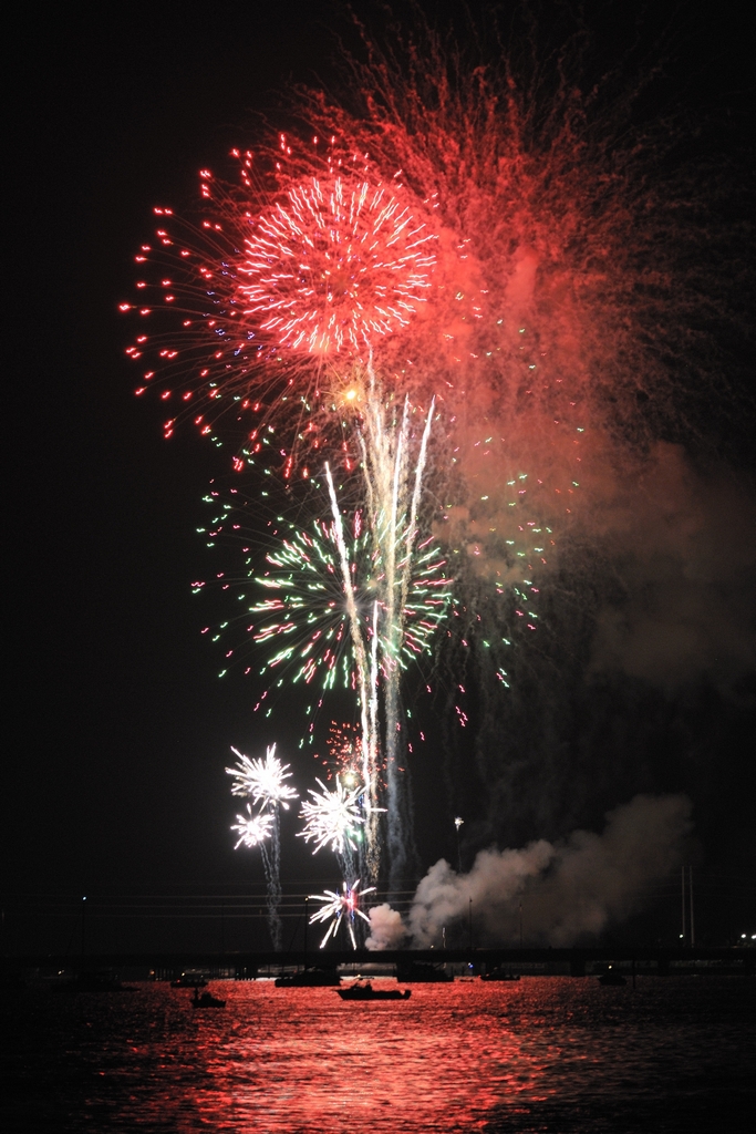 The first thing to consider is a location to shoot from. Watching fireworks is fun from up close but, taking pictures might mean staying a bit further away. This is a picture where I wanted to get our local bridge into the picture so, I shot from well down the harbor near the Isles Yacht Club. I wanted to get some foreground in the picture so, I used 1/8th of a second to make sure I stopped the boat in the reflection. When you are shooting back like this, just set the focus to manual and infinity. You don’t want your AF system to suddenly start hunting as the fireworks appear and disappear.