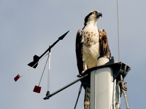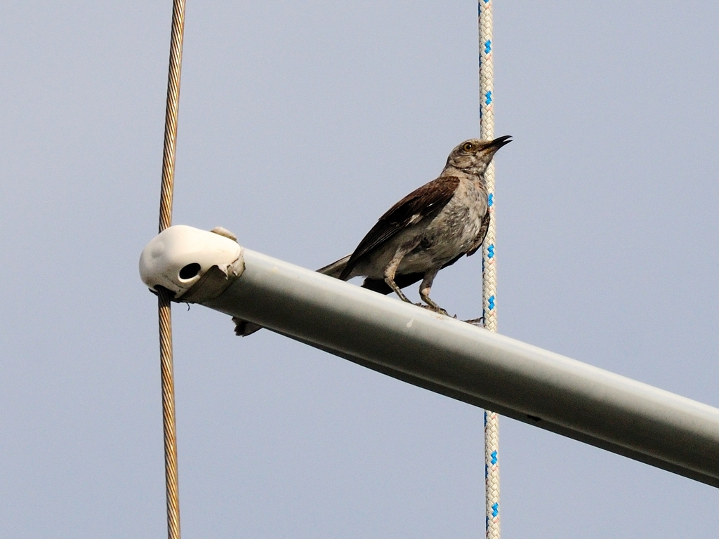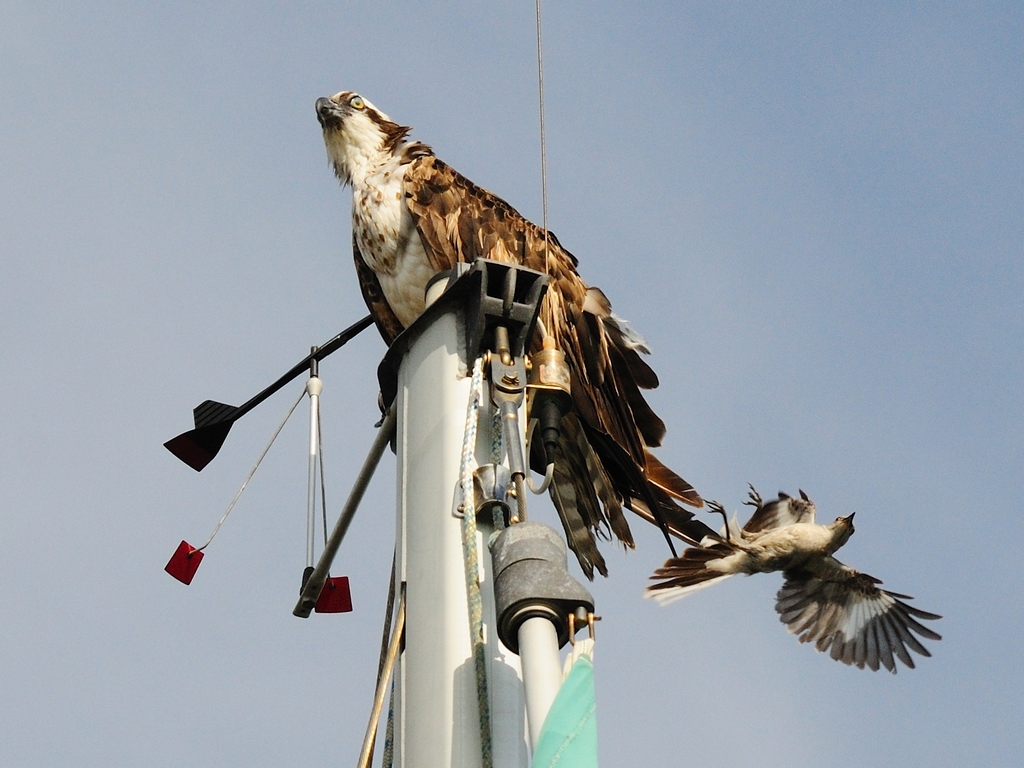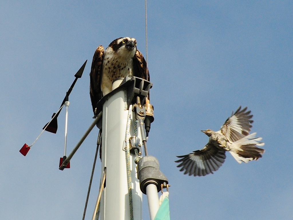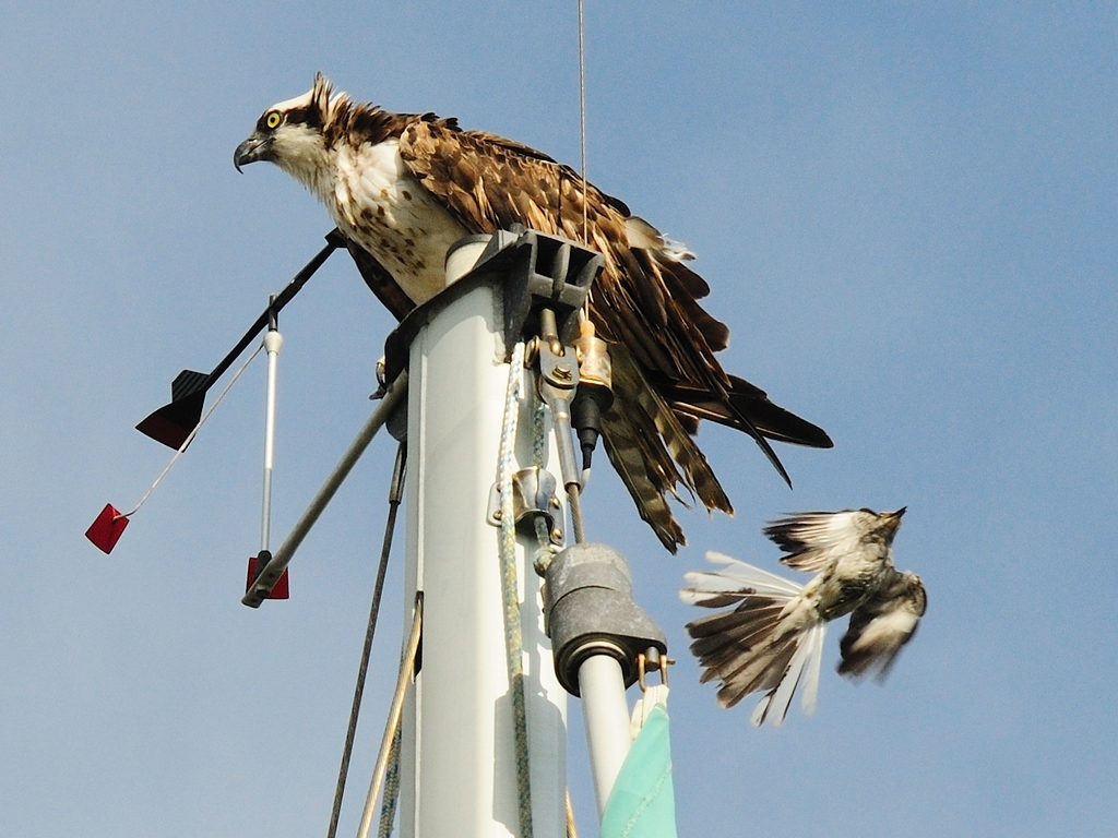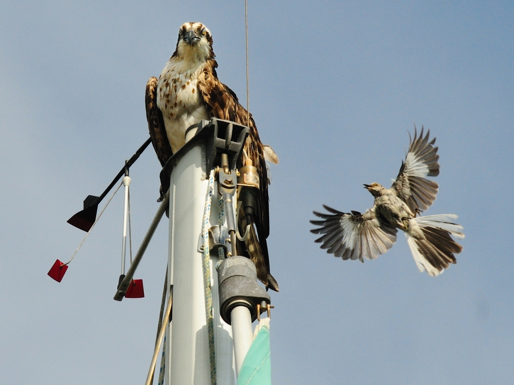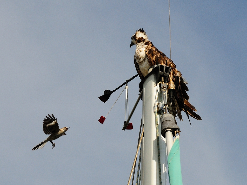 The other day, an Osprey (Pandion haliaetus) chose the mast of my boat to dry off after missing a couple of fish. This drew the attention of a of Mockingbird (Mimus polyglottos) which was nesting on the other side of the canal. I haven’t found the nest over there but, it must be close enough to need protection. Here are the protagonists. On the left, a wet Osprey which needs to rest up and dry before trying again. On the right, the Mockingbird taking a break from harassing the Osprey.