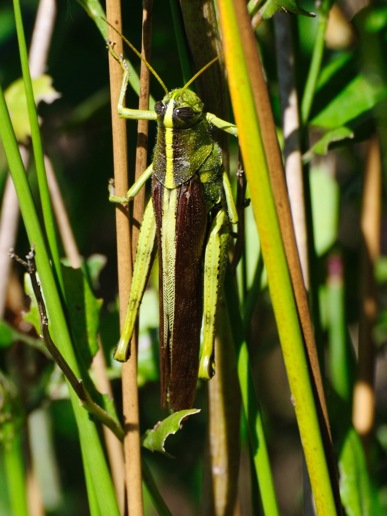 While in South Carolina, I took a walk by a pond at our stop in Bluffton. I stood still for a while just watching for unusual movement and was able to find these two very well camoflaged grasshoppers. I haven’t got the names on them yet.