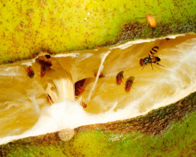 The vinegar flies were actually burrowing deep into the orange while the striped wing one was content to drink juice from the surface.