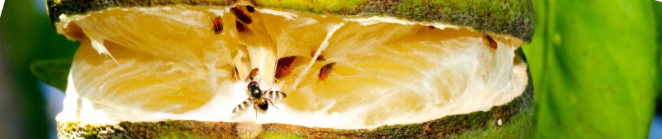 I have an orange tree in my yard which normally produces really good juice oranges. This year, I’m not going to get much of a crop because the fruit is splitting and the flies are getting all that good sweet juice before they are really ripe. Part of this comes from a lack of rain early in the season followed by a lot of rain recently. Yesterday, I found two types sharing the wealth.