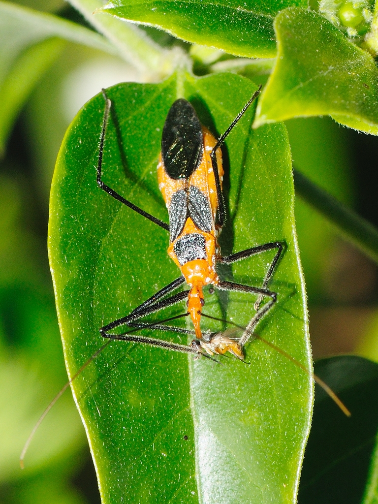 The other day, I was out and about and noticed a lot of cars in the lot at the Extension Demonstration Garden on Florida Avenue. It turned out to be the local Master Gardeners having a plant and cutting sale. I didn’t buy anything but did notice that the garden had loads of butterflies flitting about. While I was chasing them about, I discovered this Milkweed Assassin Bug ( Zelus longipes ) which had managed to snag a Long-Legged Flew (note past tense). The Long-legged flies are tiny colorful and fast. I guess the Assassin Bug was just a little quicker though.