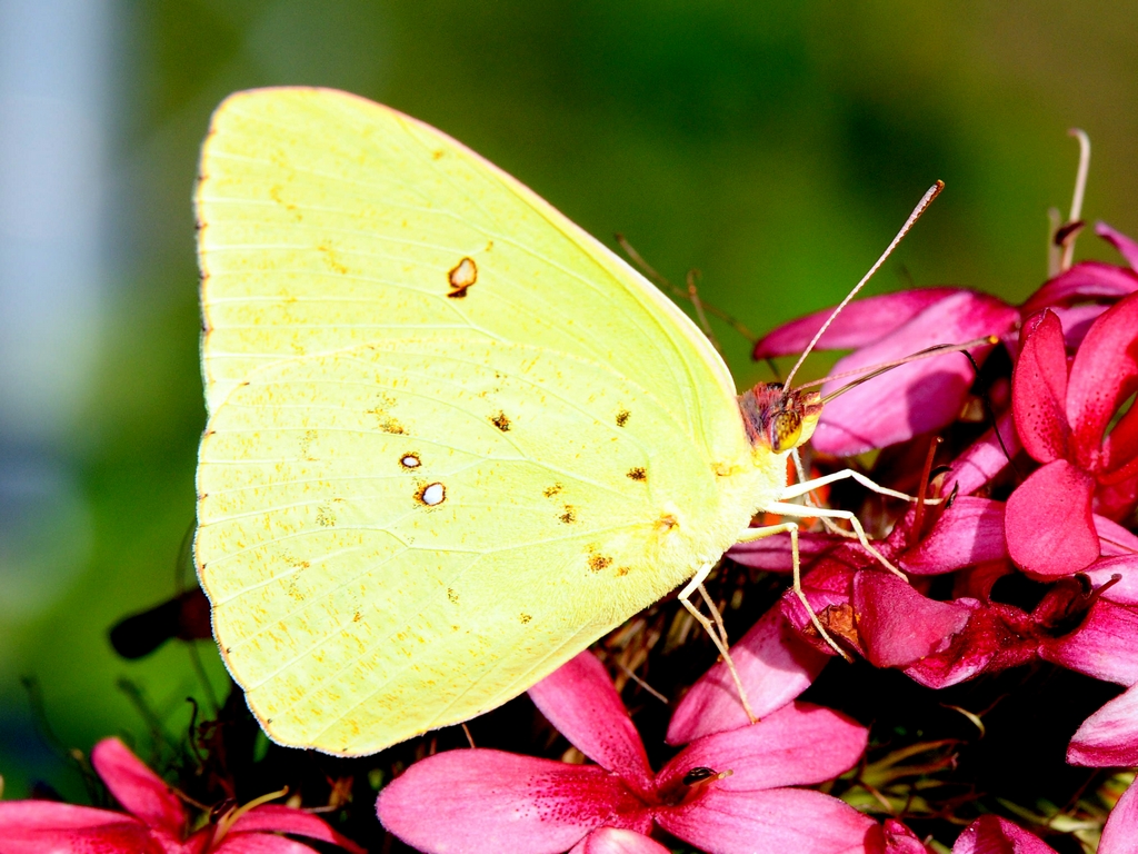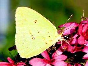Another Skipper (Brazilian?) was specializing in the red flowers today as was a Cloudless Sulphur ( Phoebis sennae ). Click on the pictures for a larger view and compare the antennae and you can see the typical little ‘crochet hook’ at the end of the skippers antenna.