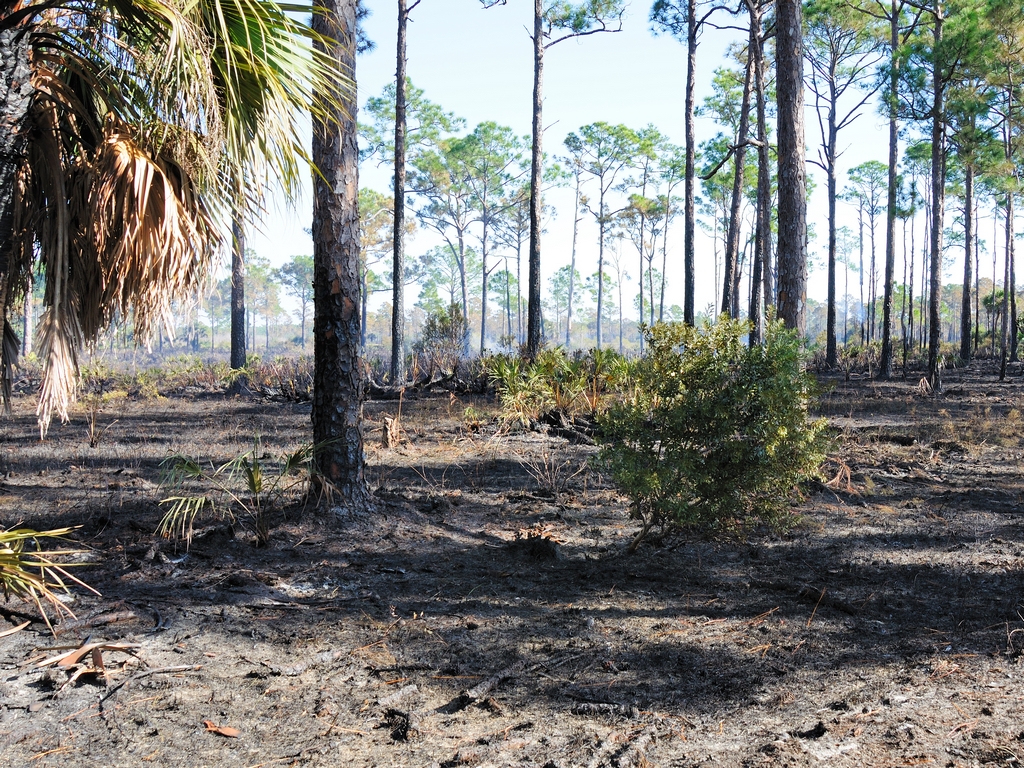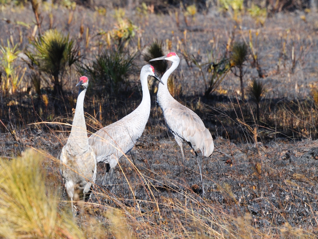 These burns are perfectly normal in the flatwoods. They don’t move fast enough to do much harm to the wildlife but, they keep the underbrush down. I did see this family of Sandhill Cranes feeding on the edges of the burn.