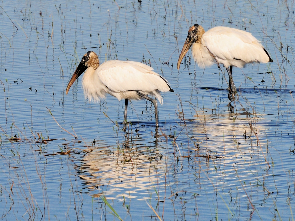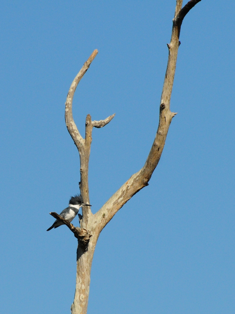 Passing along the lake, I did manage to find this Kingfisher on a distant snag and these Woodstorks wading near the edge.