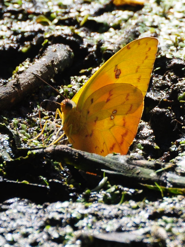 One of our small natural areas is a place called Ollies Pond. It is a nice pond in a residential area which attracts a lot of wading and water birds. I was passing by on my way back from the boatyard when I decided to stop of and see what might be going on. The parking lot wasn’t the best place to be. The sun was coming from the other side of the pond and everything was backlit with harsh sunlight. I did walk a little way with the D90 and 70-300mm VR. I found a nice dragonfly on watch and a Cloudless Sulfur mudding.