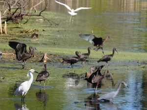 But, that was enough of bad light, I could see that there was some decent activity on the other side of the pond where the light would be better. Since it was just a quick stop, I drove around to a more favorable position. I took the header picture of a Great Blue Heron from that side and then found a little area that was just crammed with a wide variety of waders and water birds. There were Snowy Egrets, Little Blue Herons, White and Glossy Ibis, Tri-color Herons, Hooded Mergansers and a couple of other types of ducks. Here is a set of quick shots from that spot.