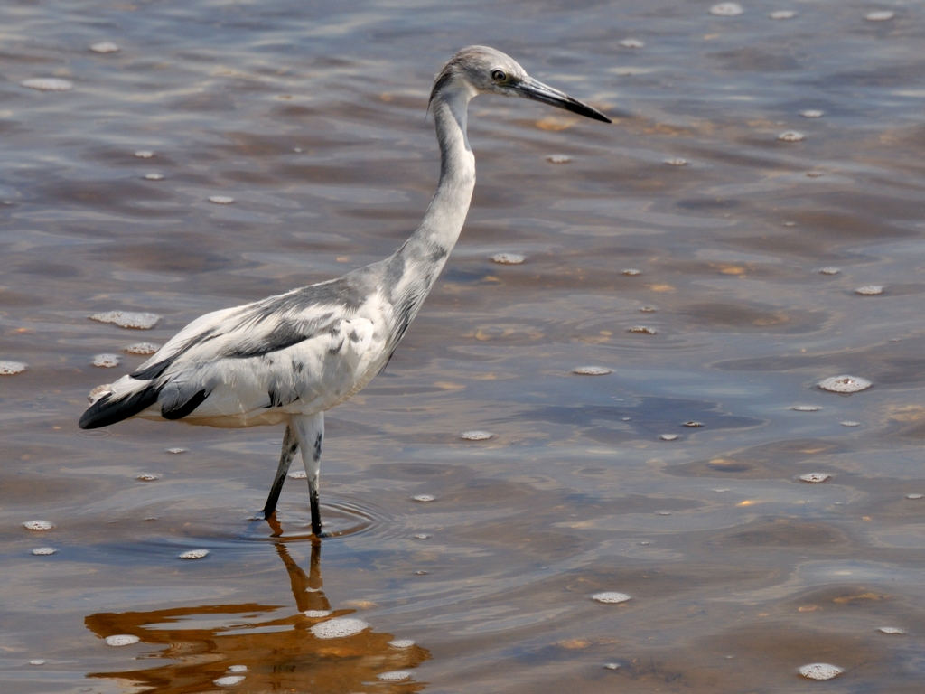 When young, Little Blue Herons are actually white and are often confused with Snowy Egrets which are about the same size. The gradually go through a dappled phase as their blue coloring comes in.