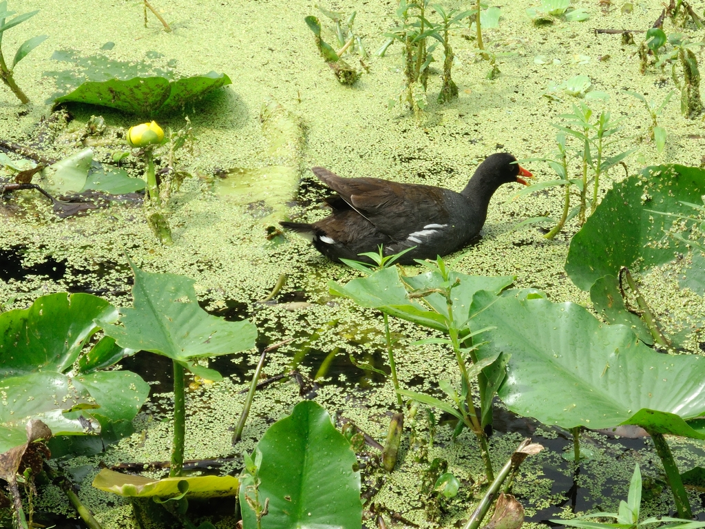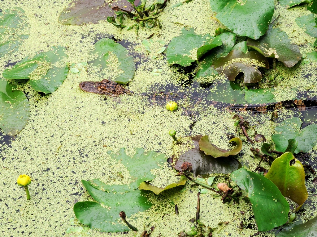 Since it was one of those rainy days, I decided not to lug the big camera but took my Nikon P7100 along. It is really good for days like this since it fits easily into the pockets of my waterproof jacket. The cloudy day made for poor bird shooting but, there were plenty along the drainage canal and boardwalk. I saw Little Blue Herons, Limpkins, Moorhens, Ibis, Great and Snowy Egrets, etc. At the first of the shelters, I found several young alligators. One of them decided to stalk a moorhen but, wasn’t very good at it. As it moved through the duckweed and spatterdock, the moorhen caught sight of it and paddled off squawking it’s alarm call.