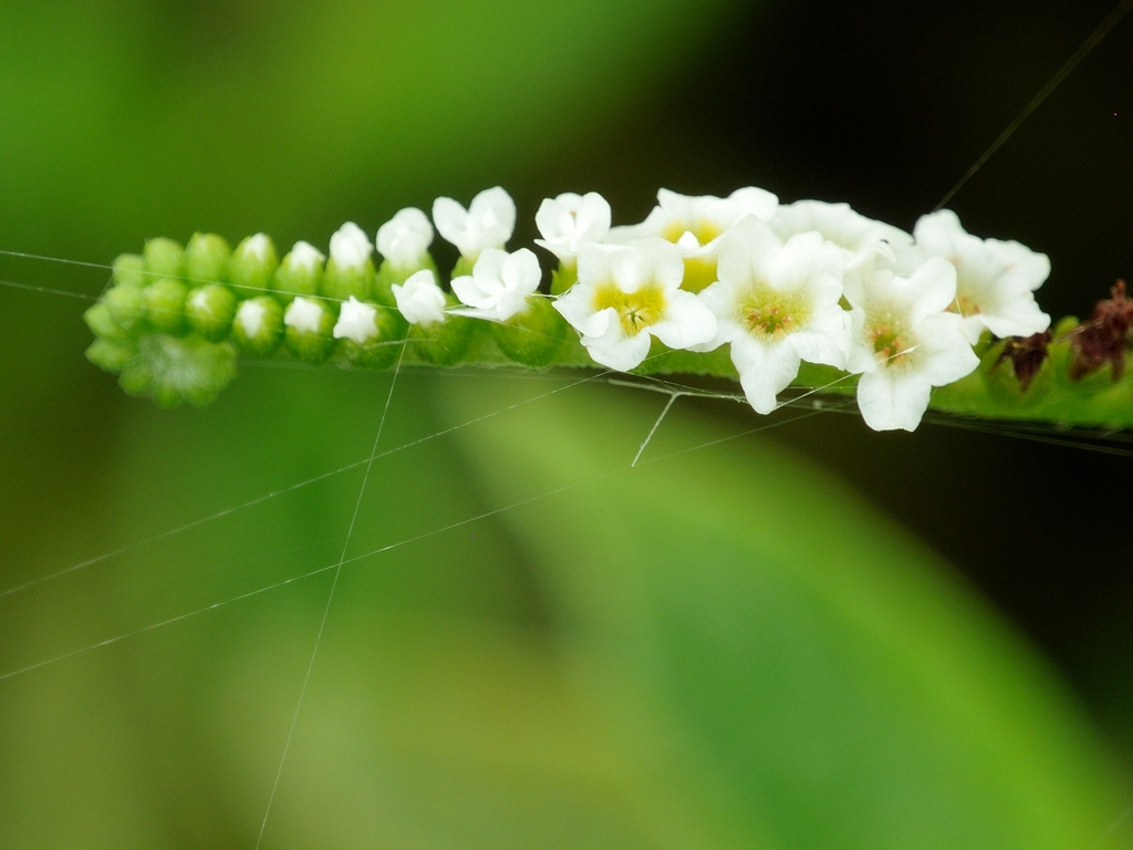 This next pair are a soft focus (unintentional 🙂 but nice) image of a plumbago flower and a Scorpions Tail – Heliotropium andiospermum. The Scorpions tail consists of a lot of small flowers which bloom in sequence. You can see those that have already bloomed, been pollinized and gone to seed on the right while the other blooms lead to the buds of the final flowers. You can tell the small size by the spider web attached to it.