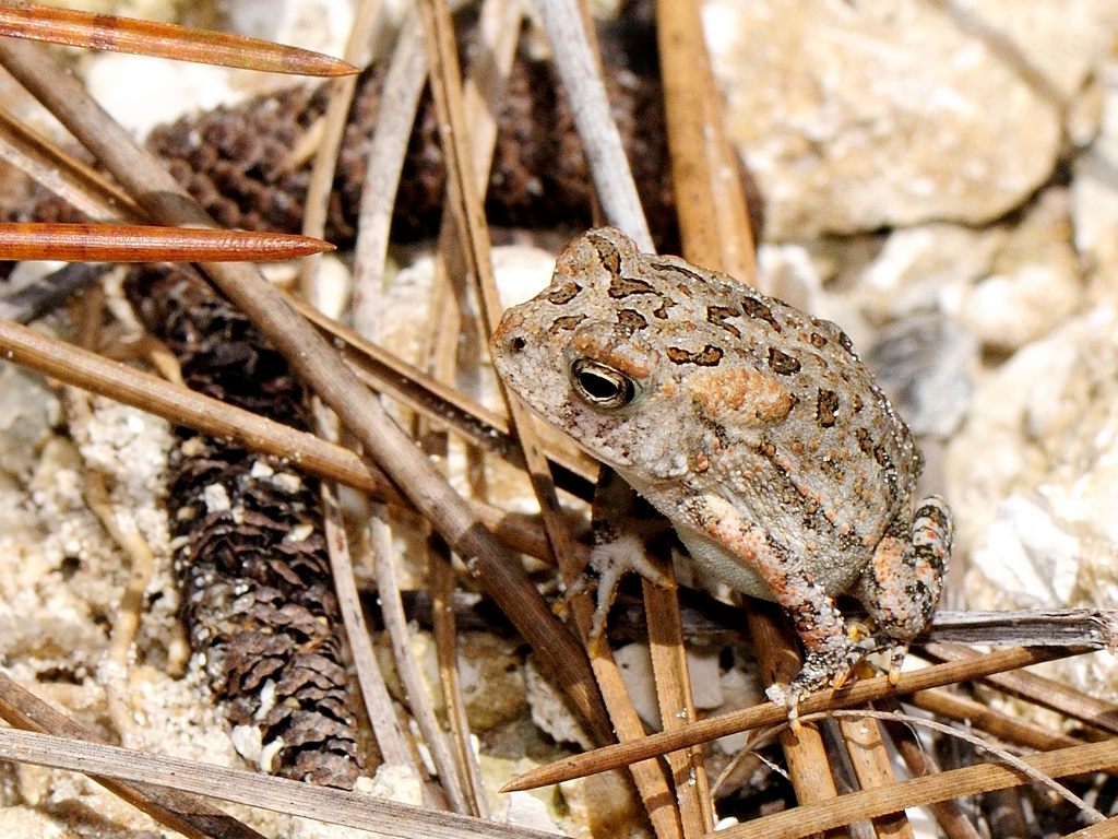 It was a cute little thing. About an inch long with legs extended. Those are pine needles that it is sitting on. One hop and it nearly disappeared into the road gravel.