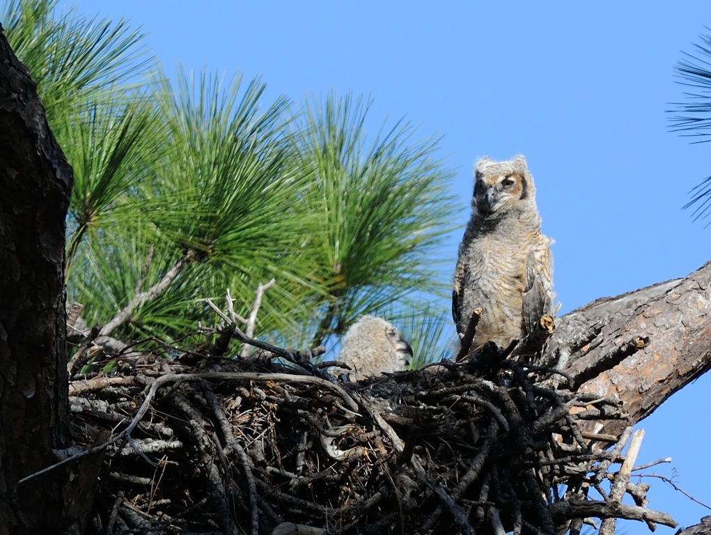 Look closely and you will see one of the baby owlets perched on the nest in the fork of the tree. Because of this distance, I prefer to use the Nikkor 70-200mm f2.8 on the FT-1 adapter for the added reach. Even then, it takes a bit of cropping. Here are a couple of examples.