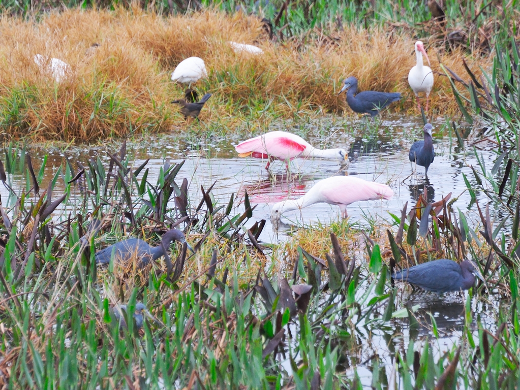 Walking on the north side on the path along Palmer Road I saw a cluster of many types of waders including several Roseate Spoonbills.