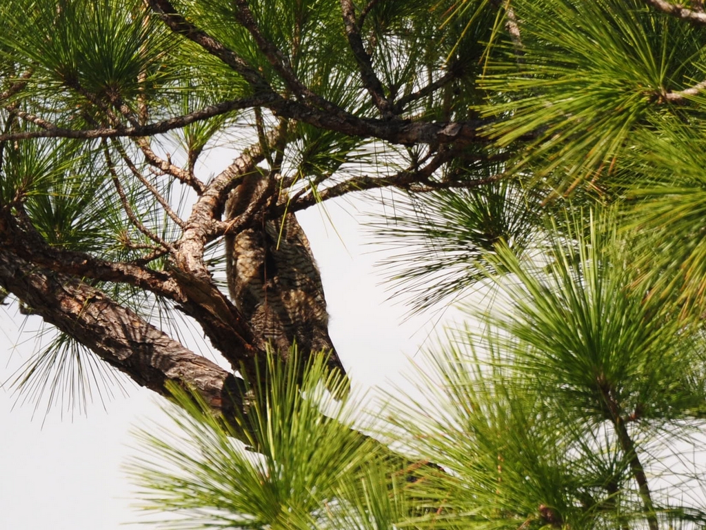 Well, the babies have taken flight. Not too far. Just to another pine with some branches which overlap. More of a hop than a flight really. I’ve seen the squirrels go further. It does make it harder to find them though. Great Horned Owls blend into the pine bark very, very well.