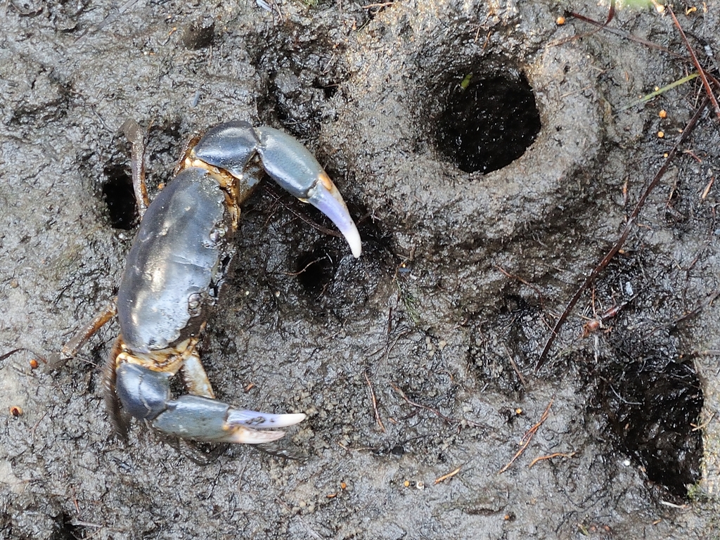 After looking at them for a while, I took to the nature trail. Not too much happening but after the fishing pier, I looked over the side to see a mangrove crab and a fiddler crab in a threat display. No fighting, just threatening moves to control their territory. This is the Mangrove Crab guarding it’s hole.