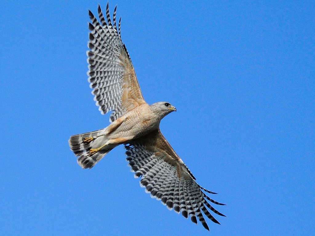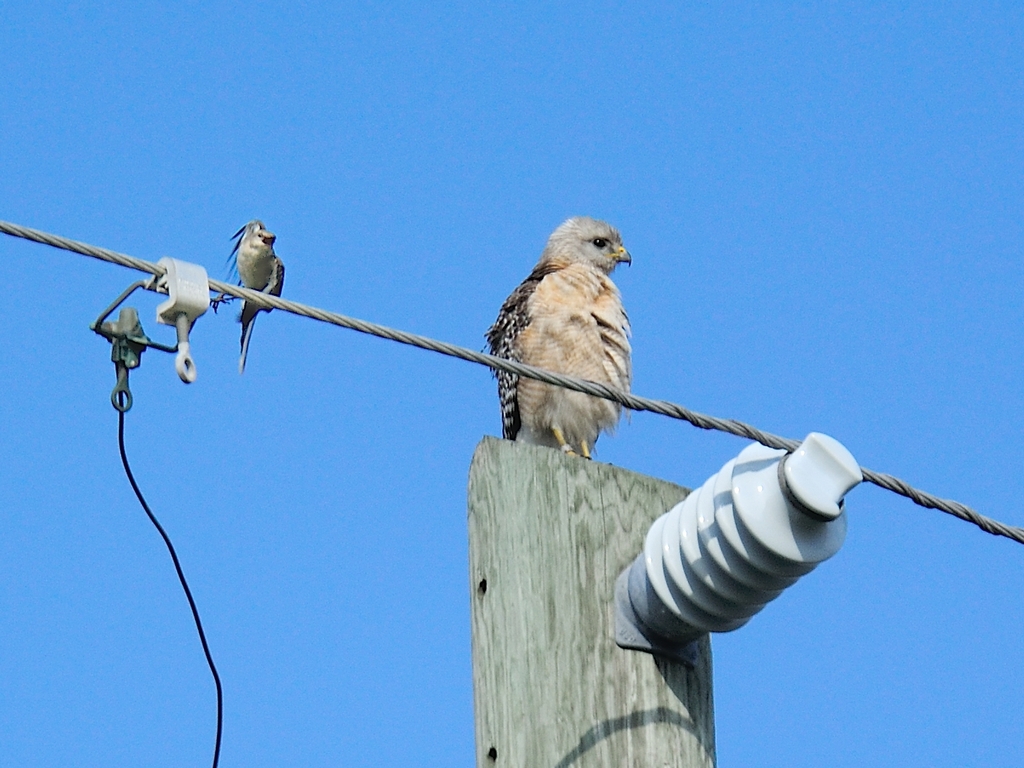 On the way back, I found a Red Shouldered Hawk sitting on the power lines. As I approached, it flew off and perched on one of the poles. This seemed to be a little too close to a Mockingbirds nest for the Mockingbird so, the smaller bird began harassing the hawk. This consists of flying and pecking at the larger bird. After a bit, the Hawk gave in and flew away.