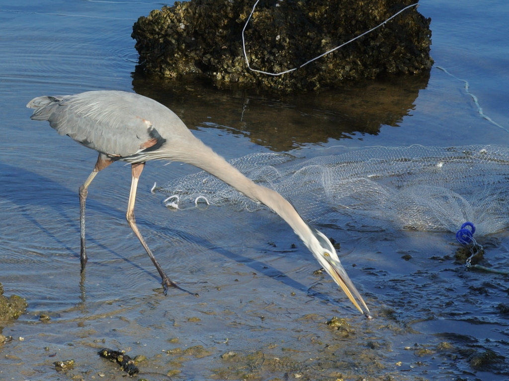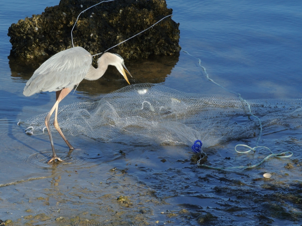 I often see herons and other birds hanging around the launch ramp and fishing piers at Ponce De Leon park. They are moochers and are looking for leftover bait at the end of the day. Quite often they are fed by the returning fishermen. This morning, I saw an instance of sportsmanlike reciprocity that astonished me. I walked along the beach watching the pelicans feeding offshore, a Yellow Crowned Night Heron and some sort of peep in the shallows. I came to a Great Blue Heron who was also walking the shallows feeding as he went. He came to a fisherman who was working from shore. The fisherman had a cast net which he had used to catch bait and had left it in the shallow water. The heron stopped and looked it over for a while, gradually getting closer. When he got very close, he suddenly stabbed down and came up with a fish that must have escaped the net. Then, he threw it back into the net for the fisherman and continued his own feeding. It was probably the most unusual human/animal interaction I have ever seen. Here are the shots. First observing the net and catching the escaped fish.