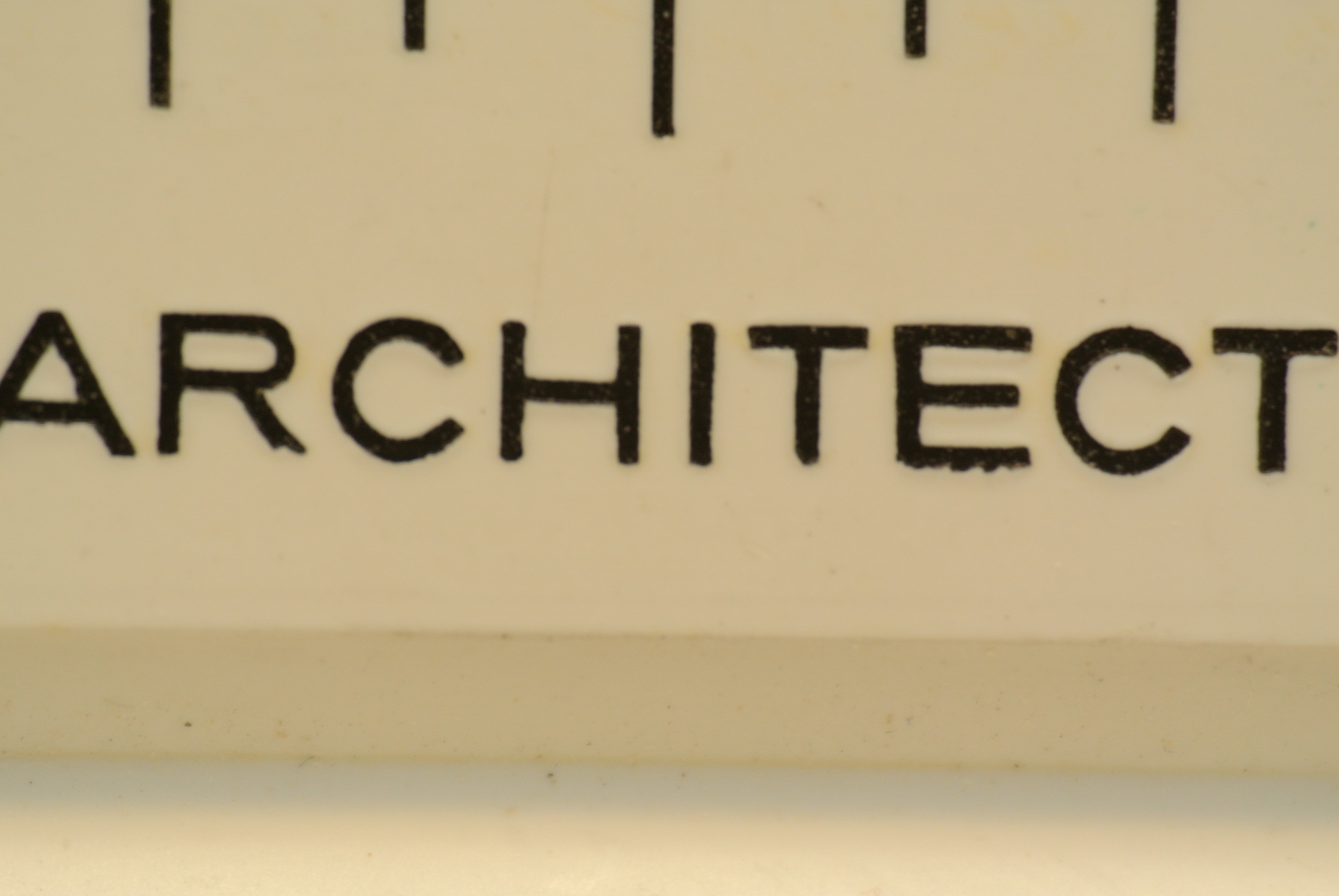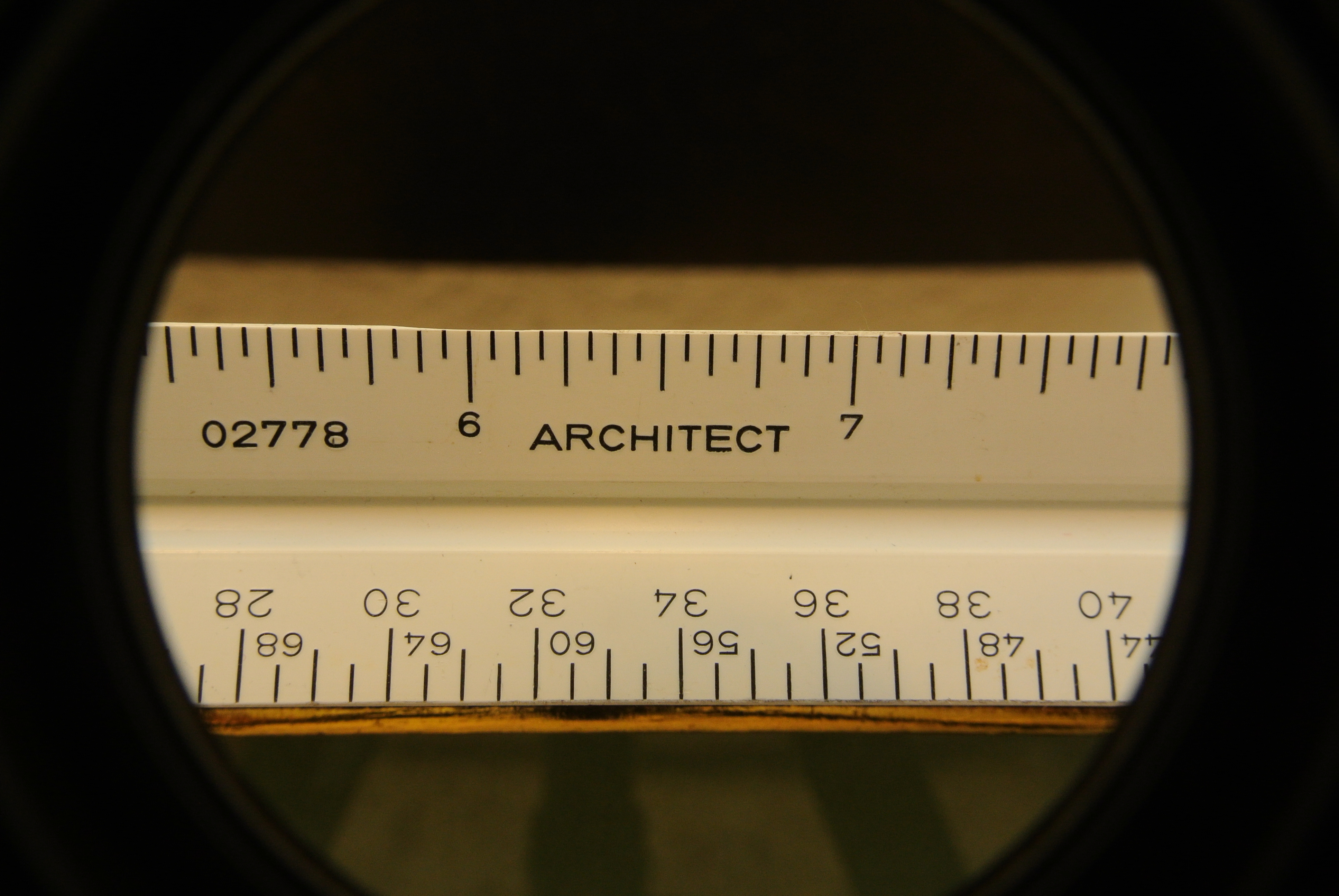 I decided to use the lenses to see how close I could get with both of the kit zoom lenses the Nikkor 1 10-30mm and the 30-110mm zooms. The setup was simple. I just put the V1 on a tabletop tripod, a triangular architects ruler on top of a picture frame and started shooting. I didn’t use manual focus. I let the AF determine the focus and slid the tripod back and forth until I could get no closer. Then I took a picture of the ruler focussed on the word ARCHITECT. Here is a shot of my super optical bench. Actually, it’s a countertop DSC_2873cr107 DSC_7402cr107