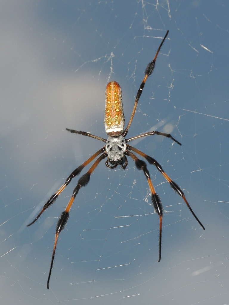 After taking this shot, I tried to get closer with Leitz ELPRO VIa but that little spider played peek-a-boo better than a mangrove crab. No matter where I tried to get a shot, it was on the other side. The best I could get was the image on the left below. I finally gave up on it. On the way back, I also found a Golden Silk Spider – Nephila Clavipes in a higher bush. It had suffered some damage but was still hunting.