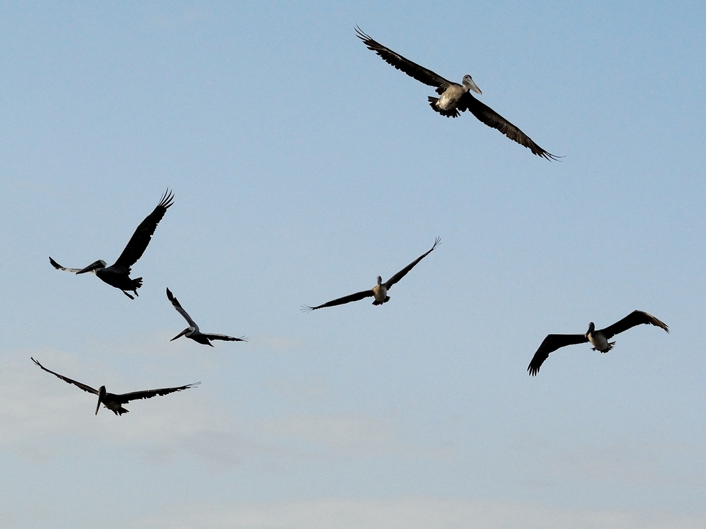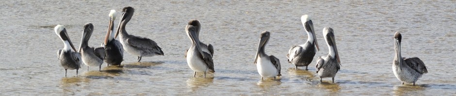 Sorry, couldn’t miss taking the opportunity for an alliterative title. Our local Brown Pelicans are beginning to change into their breeding colors and act in flocks and pairs. That means that the rookery in the mangroves will be filling up soon and we will have young in another couple of months. The banner above shows them hanging out near the fishing pier this morning. They would cluster for a while and then fly off to feed. Several of them have started pairing and flying and feeding together.