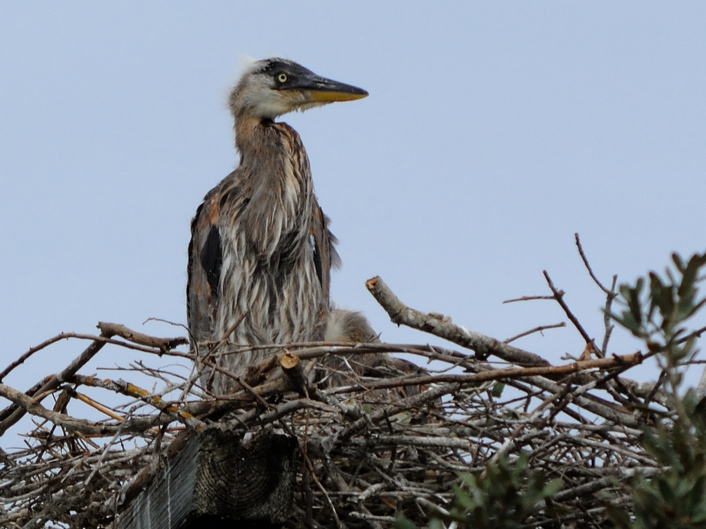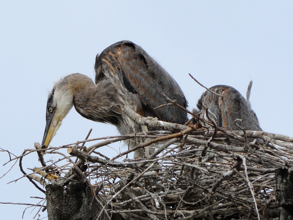 After a couple of miserable days it brightened a bit and I managed to get a few more shots of the juvenile Great Blue Herons. Mom and Dad were away and they were left to fend for themselves in the nest. The primaries are growing but there wasn’t any indication of flight play yet. Instead they spent the time trying to get rid of the baby fuzz,