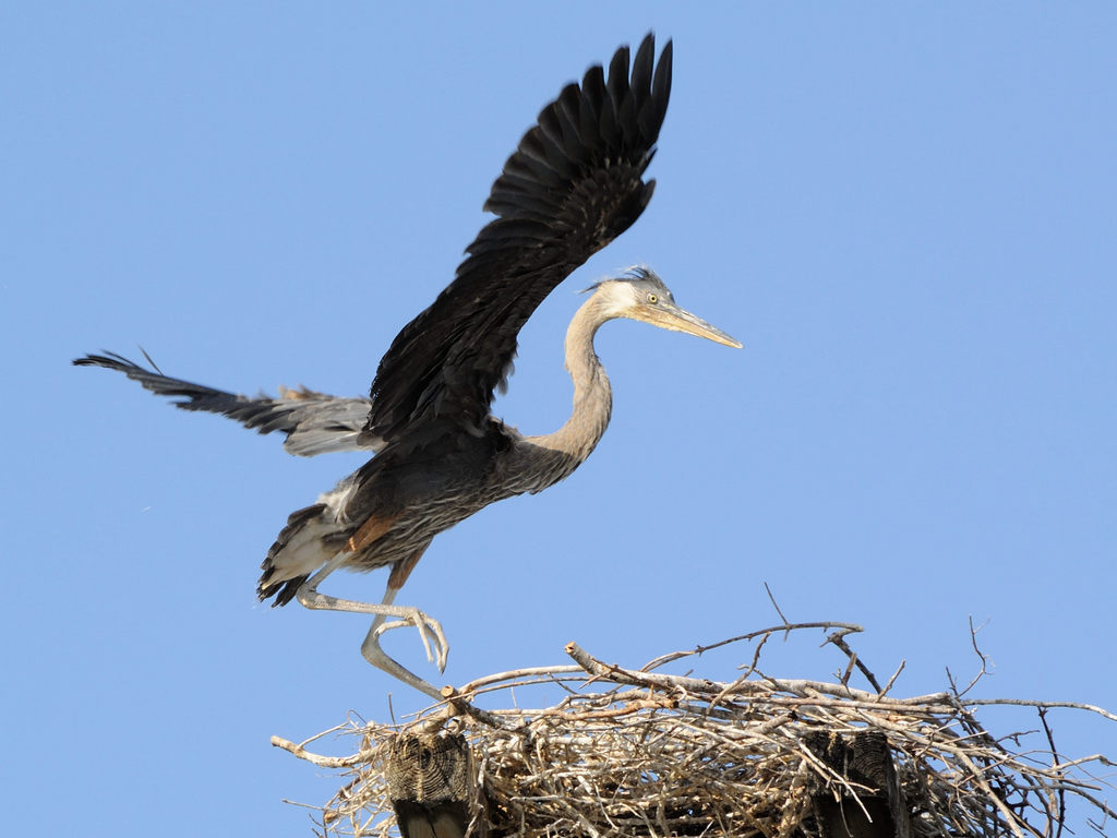 But, the attempts were for really, really short distances. The practice consisted of holding the wings up, standing on one foot and hopping to the other side of the nest. But, it’s a start and should end up with a flying heron very soon.