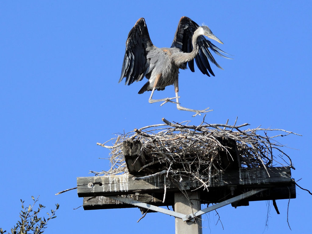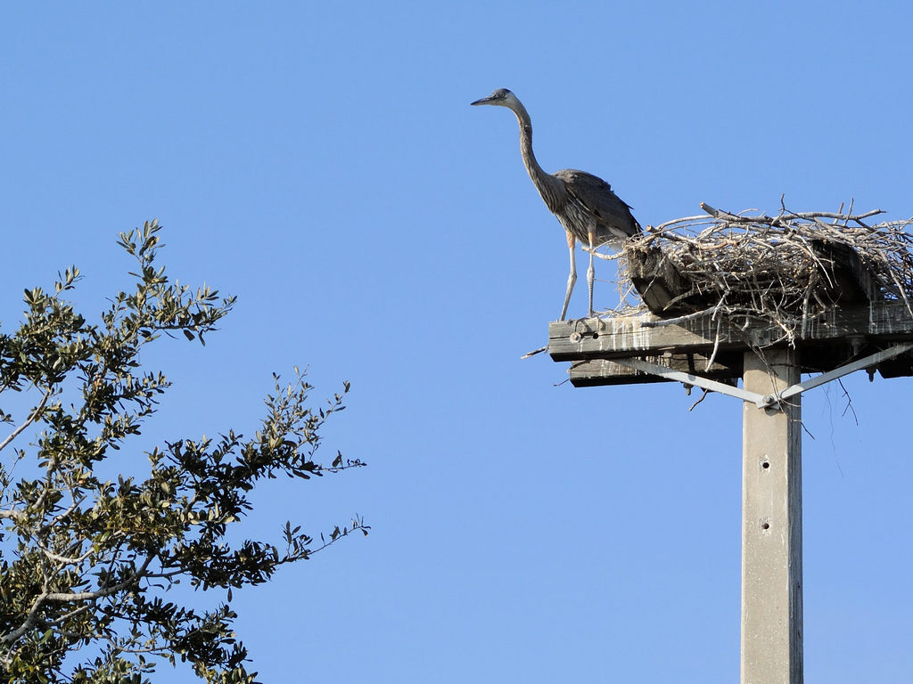 Another trip to see if the last of the pair of Great Blue Herons had left the nest. ‘Chicken’ was quite active but still couldn’t make the change from nestling to full flight. I watched it for about 20 minutes with the idea that I might actually catch it’s first flight from the nest. It didn’t even have to be much of a flight, the trees which routinely hold larger birds were only about 15 feet from the nest. This view will show you the approximate distance. But, after looking at that it decided to look straight down. OOOOOOO, Scarey.