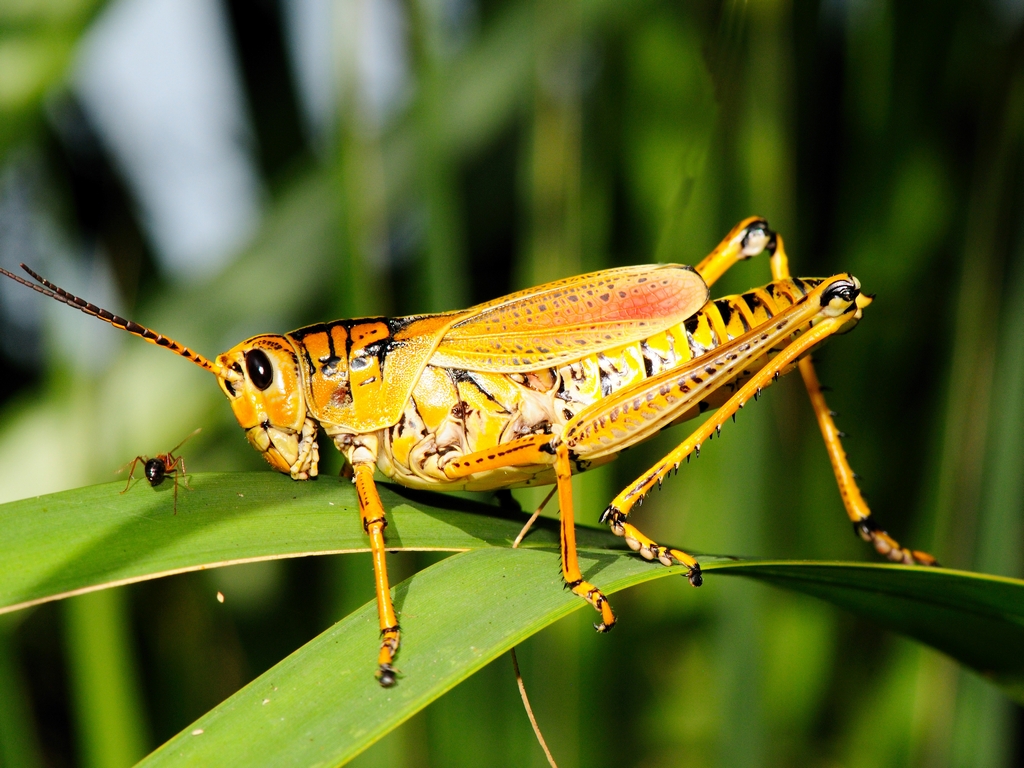 The left picture shows the view of the boat ramp looking down Shell Creek from the Canoe/Kayak/Nature trail area and the one on the right shows the view from the Kayak launch point. Once launched, you would go right around the foliage shown on the right and you would enter Shell Creek near the boat ramp. But, I wasn’t on the water, I took the nature path to see what was to be found. The rains had refreshed and invigorated everything. Wildflowers were abundant as were insects. If you recall the old fable of the ants and grasshopper you might find this picture amusing. The grasshopper is an Eastern Lubber – Romalea guttata and the ant is uhhhhhhh, an ant.